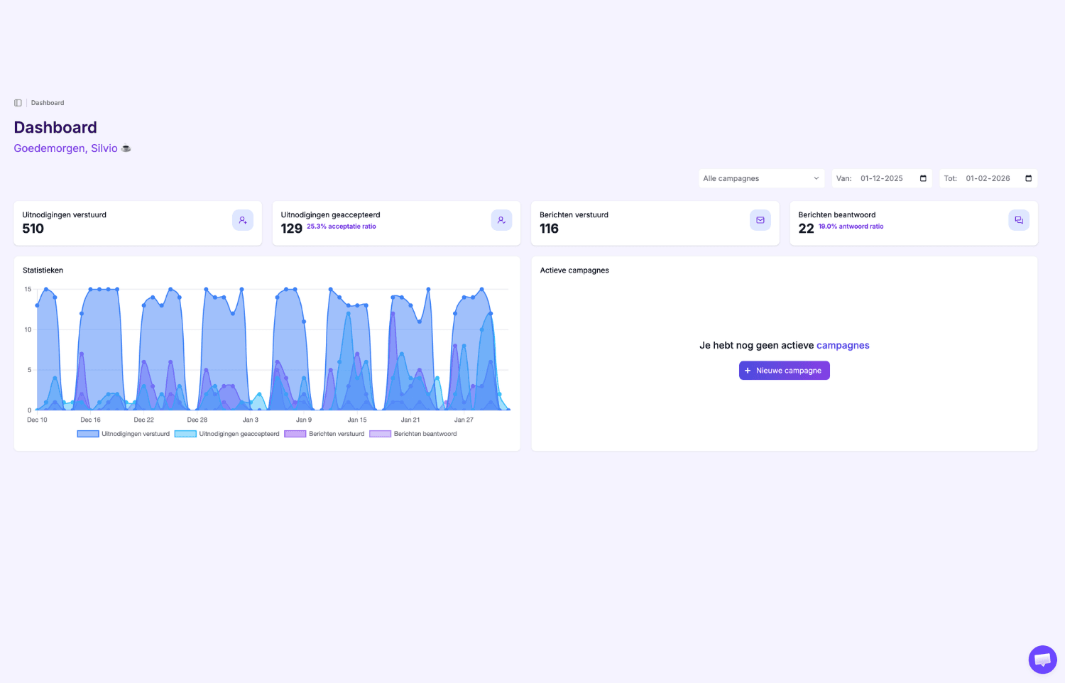 Dat verschilt per niche en doelgroep. Gemiddeld zien we een constante instroom van nieuwe gesprekken per maand, maar we kijken altijd naar kwaliteit boven kwantiteit.